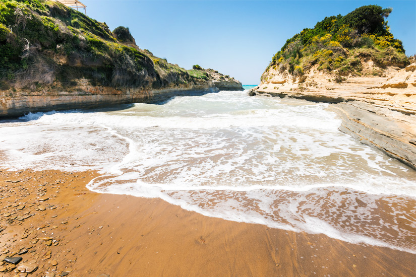 Weniger stark frequentiert und auch für FKK-Urlauber gut geeignet ist der Strand von Myrtiotissa, der genauer gesagt eine Bucht zwischen den Felsen ist. Es gibt hier keine Gastronomie und nur wenig Schatten, weshalb Badende unbedingt für Sonnenschutz, Verpflegung und auch passendes Schuhwerk sorgen sollten. Dafür ist es an diesem Strand auf Korfu aber besonders ruhig und traumhaft schön! Hier gibt es außerdem ein toll gelegenes Kloster, das eine wunderbare Aussicht bietet.