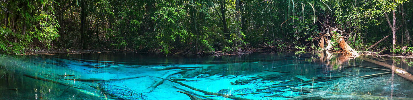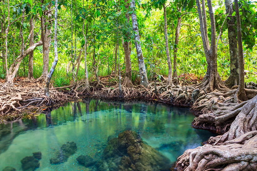 Mindestens ebenso bekannt ist der „Emerald Pool“. Das natürliche Wasserbecken befindet sich nur unweit von den Quellen im Khao Nor Chu Chi Wald entfernt und erlaubt euch durch das kristallklare Wasser einen freien Blick bis auf den Grund. Erreichen könnt ihr ihn nur zu Fuß, jedoch ist die etwa 1,2 Kilometer weite Strecke nicht allzu beschwerlich und auch von weniger fitten Personen problemlos zu meistern. Eine Wanderung, die sich definitiv lohnt. Vorbei geht es an zahlreichen kleinen Pools, bis ihr mit dem Emerald Pool – oder Sa Morakot, wie die Einheimischen ihn nennen – den Schönsten erreicht. Hier könnt ihr euch bei einer nassen Abkühlung im tiefblauen Wasser für die Anstrengungen belohnen und ein Bad vor der einmaligen Kulisse des Regenwalds nehmen.