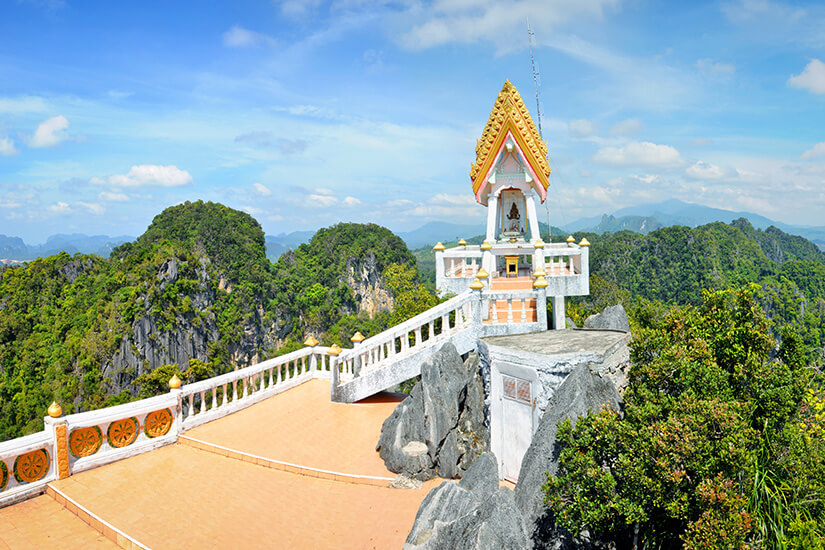 Wat Tham Sua – besser bekannt als die „Tiger Cave“ – liegt nur weniger Kilometer von der Stadt Krabi entfernt. Hierbei handelt es sich um ein weitverzweigtes Höhlensystem, welches sich inmitten des dichten Dschungels erstreckt und schon seit vielen Jahrhunderten von Mönchen bewohnt wird. Sie haben darin imposante Relikte, Statuen und Tempel erbaut, welche euch spannende Geschichten aus vergangenen Jahrhunderten erzählen. Ihren Namen verdankt die „Tigerhöhle“ beinahe verblassten, aber nach wie vor sichtbaren Abdrücken von Tigertatzen im Boden. Wenn ihr einen Abstecher zur Tiger Cave macht, solltet ihr zudem die 1237 Stufen auf die Kalksteinspitze erklimmen, um eine einmalige Aussicht über Krabi und seinen Regenwald bis zu den vorgelagerten Inseln zu genießen. Besonders empfehlenswert ist das zum Sonnenaufgang oder Sonnenuntergang. Ein Erlebnis, welches ihr garantiert nie wieder vergessen werdet!