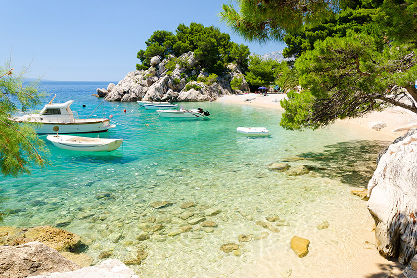Makarska an der Makarska Riviera liegt südlich von Split und zeichnet sich durch das idyllische Ambiente aus. Im Hintergrund begleiten euch duftende, grüne Pinienwälder und vor euch liegt das scheinbar nie endende Blau des Meeres. Gepflegte Badeplätze, die teilweise zu den schönsten des Landes gehören sollen, und sauberes Wasser punkten zusätzlich bei einem Urlaub in Makarska oder naheliegenden Orten wie Brela. Aufgrund der Landschaft ist der Ort auch ein Top-Ziel für Naturfreunde.
