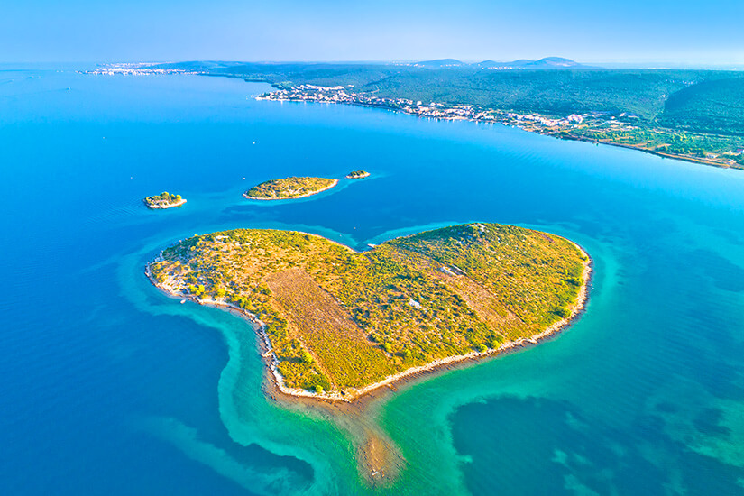 Die Insel Galešnjak ist etwas ganz Besonderes, denn sie hat die Form eines Herzes. Aus diesem Grund wird sie auch die „Insel der Liebenden“ genannt. Hier zieht es viele verliebte Paare her, die einen Heiratsantrag planen, ihre Flitterwochen verbringen wollen oder einfach nur auf der Suche nach einem romantischen Fleckchen Erde sind. Auf der Fahrt nach Galešnjak wird euch die Insel schon von Weitem auffallen, denn sie erhebt sich wie ein grünes Herz aus dem Wasser.