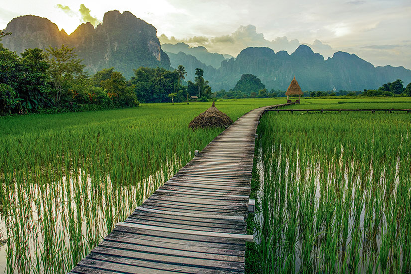 Die Hauptstadt Vientiane vereint den französischen Kolonialstil mit dem Flair buddhistischer Tempel. An romantischen Alleen stehen berühmte Schreine wie der Wat Si Saket mit einer Fülle von Buddha-Bildern. Ebenso sehenswert ist das Laotische Nationalmuseum, das in einem Kolonialgebäude untergebracht ist und sich mit der Revolution der 1970er-Jahre beschäftigt. Da sich die Stadt in einer Tiefebene am Ufer des Mekong befindet, lädt die Umgebung zu schönen Ausflügen in die Natur ein.