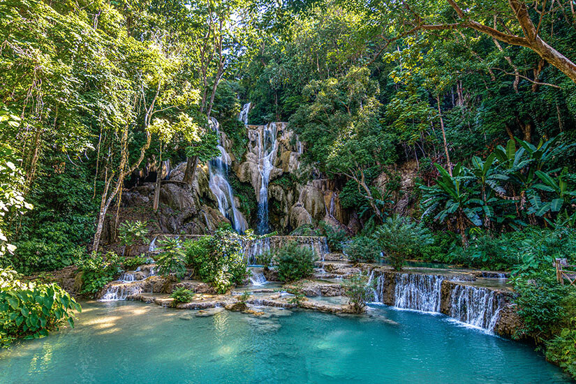 Naturliebhaber und Romantiker werden sich an diesem Ort wohlfühlen. An den mehrstufigen Kuang Si Wasserfällen spürt ihr die gigantische Kraft der Natur. Der Hauptwasserfall stürzt sich über bizarre Karstfelsen rund 60 Meter in die Tiefe. Weiter unten haben sich türkisblaue Pools gebildet, die ein atemberaubendes Bild abgeben. Wenn ihr dieses Naturschauspiel selbst erleben möchtet, könnt ihr in die Provinz Luang Prabang fahren. Der Wasserfall befindet sich im Naturschutzgebiet Tat Kuang Si Park, in dem es zudem eine Auffangstation für Kragenbären gibt.