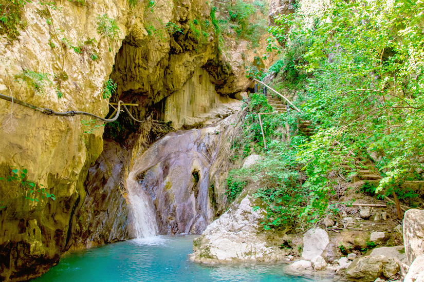 Ein paar Kilometer oberhalb des Örtchens Nydri liegt die Schlucht von Dimosari, die eine wunderbare Naturoase beherbergt. Denn besonders im Frühjahr, wenn genug Wasser über die Berge fließt, werdet ihr hier einen entzückenden Wasserfall vorfinden.