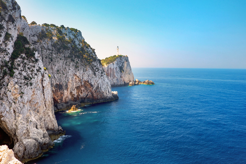 Heute ist von Apollos Tempel und traurigen Mädchen nichts mehr zu sehen, dafür steht hier ein Leuchtturm und es bietet sich euch eine umwerfende Aussicht auf die steilen Felswände der Insel und das Meer. Bei gutem Wetter könnt ihr sogar bis nach Ithaka und Kefalonia schauen.