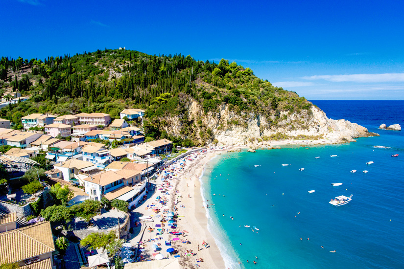 Direkt nordwestlich von Lefkada-Stadt liegt ein schmaler, sehr langer Sandstrand, der besonders bei Kite-Surfern beliebt ist. Denn hier ist es die meiste Zeit über so windig, dass teilweise sogar Wettbewerbe ausgetragen werden. In den Restaurants, die in großer Zahl unmittelbar in der Nähe liegen, könnt ihr tolles, griechisches Essen und einen fantastischen Sonnenuntergang erleben.