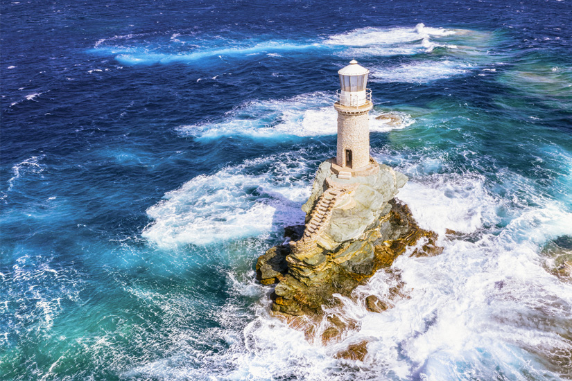 Der Faros Tourlitis auf der gleichnamigen kleinen Felsinsel in der Hafenbucht der Stadt Andros ist eine der beliebtesten Sehenswürdigkeiten der griechischen Kykladen. Der völlig isolierte, sieben Meter hohe Turm ist über eine in den Fels geschlagene Treppe zu erreichen und wurde im Original 1897 erbaut. Luftangriffe während des Zweiten Weltkrieges zerstörten den Bau jedoch im Jahr 1943 und es dauerte mehr als 50 Jahre bis der Leuchtturm aus hellem Naturstein mit weißer Galerie originalgetreu renoviert werden konnte. Eine Geschichte mit viel Herz.