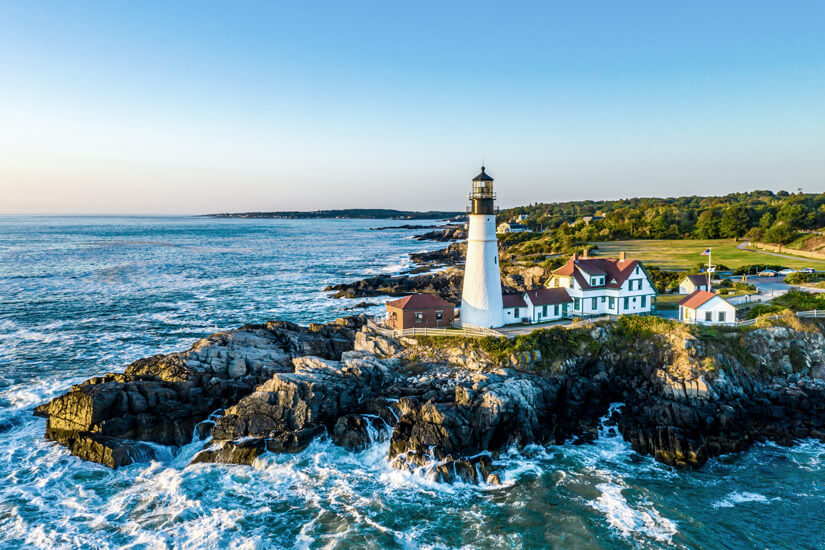 Portland Head Light wurde 1791 in Betrieb genommen und ist somit der älteste Leuchtturm des US-amerikanischen Bundesstaates Maine. Die Landzunge besteht aus ungewöhnlichen Felsformationen, die wie versteinertes Holz aussehen. Tatsächlich jedoch handelt es sich um Quarzit und dunkelgrauen Phyllit. Bei rauer See brechen die Wellen in der Bucht auf imposante Art und Weise. Heute befindet sich in dem 23 Meter hohen Turm ein Museum, das jedes Jahr zahlreiche Besucher anlockt.
