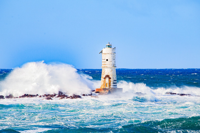 Dieser Leuchtturm auf Sardinien befindet sich auf einem felsigen Eiland, das kaum aus der Meeresoberfläche herausragt. In der Vergangenheit sorgten die schroff ins Meer abfallenden Klippen für zahlreiche Schiffbrüche. Einheimische nennen den Standort auch gerne „Das Ungeheuer von Mangiabarche“, wobei die scharfen Felskanten als Zähne des Monsters interpretiert werden.