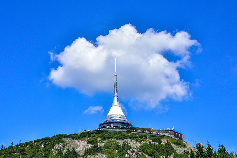 Auf dem Ještěd (zu Deutsch Jeschken), den viele Besucher Liberecs als Ausflugsziel nutzen, findet ihr ein außergewöhnlich gestaltetes Bauwerk mit Aussicht. Der Fernsehturm aus dem Jahr 1973 verfügt über eine harmonische Silhouette, die farblich bestens auf den Berg abgestimmt wurde. Sie mündet in einem langen, röhrenförmigen Gebilde und erscheint von weitem fast so, als sei das Gebäude die natürliche Ergänzung des Hügels. Im Inneren befindet sich neben den Betriebsräumen ein Hotel mit Restaurant. Seid ihr dort einmal nach einer Wanderung angekommen, erstreckt sich das Naturpanorama von Nordtschechien zu euren Füßen.