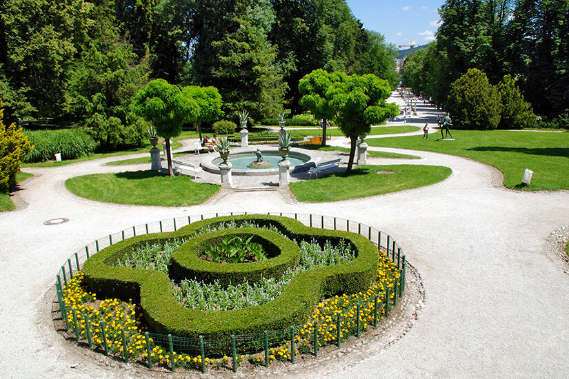 Der Stadtpark Tivoli ist die grüne Lunge Ljubljanas und erstreckt sich bis in die Stadtmitte hinein. Das fünf Quadratkilometer große Areal entstand Anfang des 19. Jahrhunderts aus zwei einstigen Schlossparkanlagen. Entlang der Jakopic-Promenade gelangt ihr durch den Park zum Tivoli Schloss. Der neoklassizistische Bau beherbergt ein internationales Kunstzentrum.