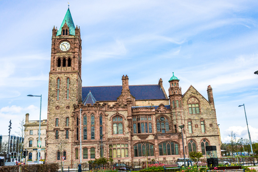 Mitten in der Stadt findet ihr ein Gebäude vor, das sowohl früher als auch heute noch im Zentrum politischen Geschehens steht. Aktuell befindet sich hier der Stadtrat. Die Guildhall befindet sich unmittelbar am Fluss Foyle und beeindruckt durch ihre spektakuläre Architektur. Roter Sandstein kleidet diesen neogotischen Bau aus dem Jahr 1890. Ein Uhrenturm, der an den Londoner Big Ben erinnert, steht dem Bauwerk zur Seite.