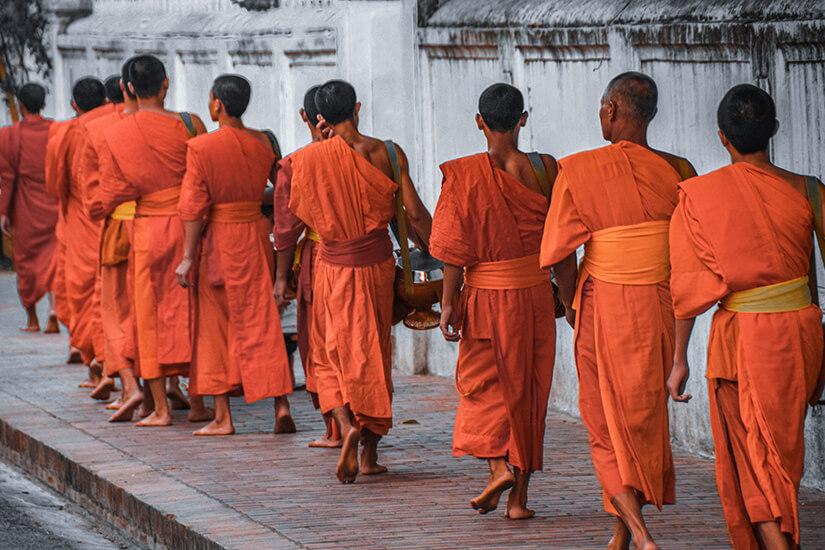 Die Sonnenaufgänge in Laos sind ein Traum – und in Luang Prabang ein spezieller Moment. Denn zu dieser Zeit findet ein buddhistisches Ritual statt. Die Mönche aus den naheliegenden Klöstern machen sich auf den Weg durch die Stadt. Der tägliche Almosengang wird Tak Bat genannt und ist eine alte Tradition. Buddhistische Mönche dürfen nicht für eine Gegenleistung arbeiten, sondern sind auf Almosen angewiesen. Diese werden jeden Morgen von den Gläubigen gespendet und von den Mönchen beim Almosengang wortlos entgegengenommen. Die Gaben bestehen oft aus Nahrungsmitteln, von denen sich die Mönche ernähren.