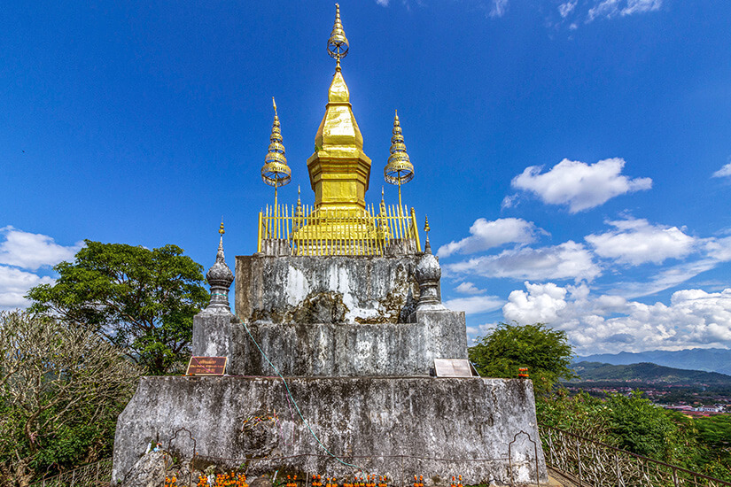 Dieser Tempelberg erhebt sich majestätisch 100 Meter über der Stadt. Er ist als Mount Phousi, Phu Si oder Phou Si bekannt. Um ihn zu begehen, nehmt ihr die Hauptroute vom Königspalast oder den weniger frequentierten Weg an der Bambusbrücke. Aber seid vorbereitet: Es müssen viele Treppen bewältigt werden. Die Hänge sind mit pittoresken Tempeln und Schreinen geschmückt. Wenn ihr mehr über die Wandbilder und Relikte erfahren möchtet, bucht ihr eine geführte Tour. Auf dem Gipfel befindet sich der Tempel Wat Chom Si mit einer goldenen Stupa. Ein Genuss ist auch der 360-Grad-Blick, den ihr von oben auf die Stadt habt. Bei klarer Sicht sind die umliegenden Berge zu erkennen. Besonders schön ist es beim Sonnenuntergang.