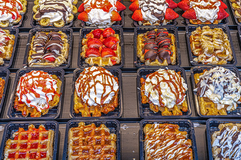 Belgisches Essen ist etwas für echte Genießer. Für den süßen Gaumen gibt es die berühmten Belgischen Waffeln, bei denen Brüsseler Waffeln und Lütticher Waffeln unterschieden werden. Die Brüsseler Variante besteht aus einem weichen Rührteig, während die dicken Lütticher Waffeln traditionellerweise aus Hefeteig gemacht werden. Sie sind zuckersüß und mit sehr viel Butter versehen. Die fruchtige Version wird mit Erdbeeren oder Bananen serviert. Eine Sünde wert sind auch die leckeren Lütticher Waffeln mit heißer Schokolade und cremiger Sahne. Wie wäre es mit einem Café Liégeois dazu? Für diese landestypische Kaffeespezialität wird Espresso mit Vanilleeis, Sahne und Karamell vereint. Ein weiterer Genuss ist der Lütticher Sirup, bei dem es sich um einen stark eingekochten Dicksaft aus Äpfeln und Birnen handelt. Herzhaft wird es, wenn der beliebte Bohnensalat, Salade Liégeoise oder die klassischen Lütticher Bouletten bestellt werden.