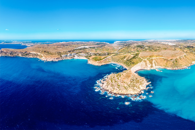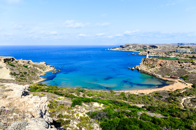 Der Strand Għajn Tuffieħa liegt nur wenige Meter weit von der Golden Bay entfernt, ist aber weniger bekannt. Um ihn zu erreichen, müsst ihr von dort etwas südlicher an der Westküste von Malta entlang. Getrennt sind beide Strände vom Għajn Tuffieħa Tower auf einer Erhebung dazwischen. Hinab in die Bucht gelangt ihr dann über viele Stufen. Unten angekommen genießt ihr eure Privatsphäre. Auch hier ist das Ufer flach und es gibt eine extra Zone für Schnorchler.