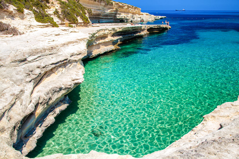 Der St. Peter’s Pool ist eine kraterartige Bucht, die keinen Sandstrand hat. Um sich zu sonnen, sollte man also eine weiche Unterlage dabeihaben. Allerdings kann man im St. Peter’s Pool an der Südspitze von Malta in unglaublich klarem Wasser baden. Es lohnt sich außerdem hier zu tauchen oder schnorcheln.