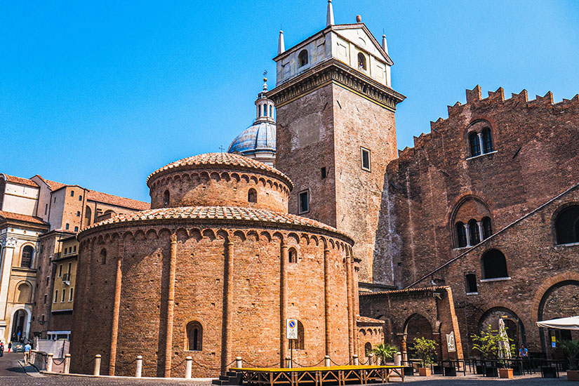 Inmitten der Piazza delle Erbe erhebt sich ein unscheinbares rundes Bauwerk, das leicht übersehen werden könnte – und doch handelt es sich um die älteste Kirche Mantuas. Die Rotonda di San Lorenzo wurde im elften Jahrhundert nach dem Vorbild der Grabeskirche in Jerusalem errichtet und bietet einen faszinierenden Kontrast zur Renaissance-Architektur, die Mantua sonst prägt. Betritt man den Raum, fühlt man sich sofort in die frühchristliche Zeit zurückversetzt. Der zweistöckige Rundbau mit seinem Matroneum (Frauenempore) und den schlanken Säulen schafft eine meditative Atmosphäre. An den Wänden könnt ihr noch Reste von byzantinisch beeinflussten Fresken aus dem elften und zwölften Jahrhundert entdecken.