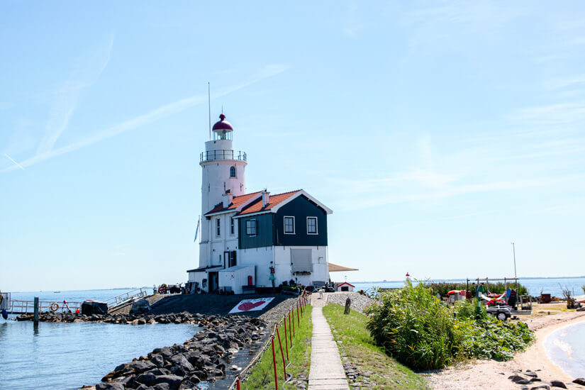 Maritimes Flair erlebt ihr an diesem imposanten Leuchtturm, der auf einer Landspitze im Markermeer steht. Er ist ein beliebtes Postkarten- und Fotomotiv. Da seine Form aus der Ferne an ein Pferd erinnert, wird er liebevoll Paard van Marken genannt. Der Turm wurde im Jahr 1839 nach den Entwürfen von J. Valk aus Klinker gebaut. Die Feuerhöhe beträgt 16 Meter.