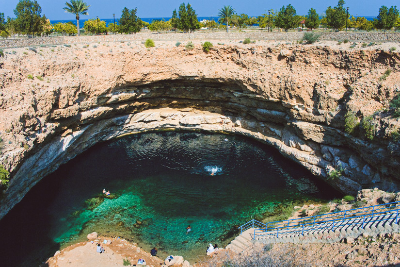Wenn ihr Lust auf einen kleinen Ausflug habt, dann fahrt ein Stück die Küste in südöstlicher Richtung entlang bis zur Ortschaft Bimmah. Dort befindet sich das sogenannte Bimmah Sinkhole, ein Krater mit einer blaugrünen Lagune, in der ihr auch baden dürft. Eine tolle Abkühlung mitten in der Wüste. Eigentlich entstand das Sinkloch durch Unterspülung. Den Menschen in Bimmah aber gefällt die Legende, dass ein himmlischer Meteorit das Loch geschlagen hat, besser. Daher nennen sie das Loch auch gern „Hawiyat Najm“, was so viel wie „Sternschnuppe“ bedeutet.