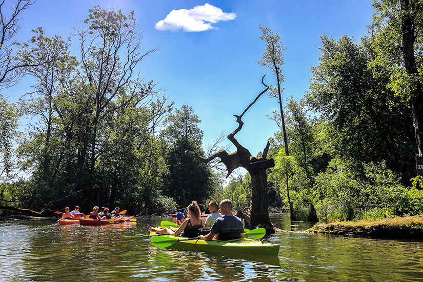 Doch auch Kanuwanderungen sind eine tolle Aktivität in den Masuren. Dabei seid ihr mehrere Tage in der Gruppe unterwegs und übernachtet in unterschiedlichen Unterkünften oder Campingplätzen am Wasser. Mit etwas Glück seht ihr unterwegs neugierige Bieber, elegante Schwarzstörche oder sogar sanftmütige Elche. Ob Kanu, Kajak oder Gummiboot – die Boote könnt ihr euch ganz unkompliziert an zahlreichen Stationen ausleihen und nach einer kurzen Einweisung auch direkt lospaddeln. Das Tolle daran: Ihr müsst nicht zwingend zum Startpunkt zurück, denn viele Kanu-Services holen die wieder Boote dort ab, wo ihr ausgestiegen seid.
