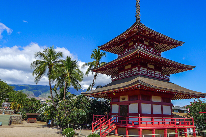 Seit 1912 gibt es auf Maui auch einen buddhistischen Tempel, die Lahaina Jodo Mission, mit einer fast vier Meter großen Buddha-Statue. Letztere wurde im Jahr 1968 errichtet, um das 100-jährige Jubiläum der japanischen Einwanderer in Hawaii zu feiern. Leider wurden einige der Gebäude während der Waldbrände 2023 zerstört, aber die Amida Buddha Statue ist nach wie vor zu sehen. Informiert euch vor eurem Besuch über aktuelle Öffnungszeiten.