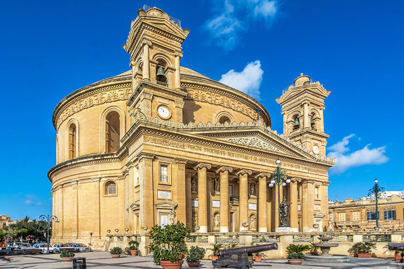 Ein Urlaub in Mdina oder Rabat sollte nicht ohne einen Zwischenstopp in einer der ältesten Siedlungen Maltas erfolgen. Das absolute Highlight in Mosta ist wohl die Maria-Himmelfahrts-Kirche, die auch als Rotunde von Mosta bekannt ist. Sie besitzt die viertgrößte Kirchenkuppel der Welt, wirklich rekordverdächtig! Ihr Durchmesser beträgt ganze 39 Meter und ist von innen stilvoll in den Farben Blau, Gold und Weiß gehalten. Der Ortsname stammt vermutlich aus dem arabischen und bedeutet abgeleitet so viel wie „Mitte“, was somit die Lage der Stadt auf der Insel klar macht.