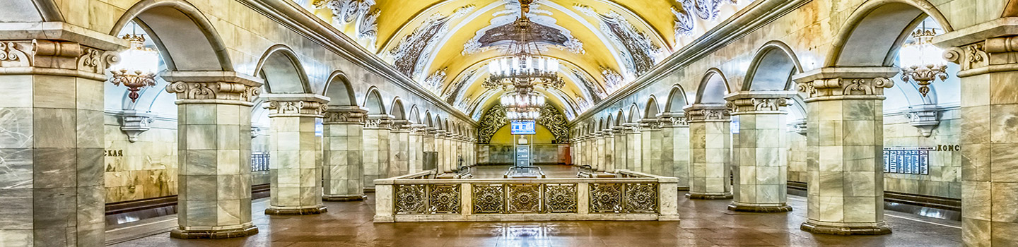 Die Moskauer Metro-Stationen der sind allesamt ein Highlight für sich, denn sie muten wie prunkvolle Paläste unter der Erde an. Der Halt Komsomolskaja hat uns aber besonders in den Bann gezogen. Opulente Kronleuchter und jede Menge Gold scheinen euch in eine ganz eigene kleine Welt zu entführen – und das direkt unter den Straßen von Moskau, in etwa 37 Metern Tiefe. Die ebenfalls auffällige Eingangshalle mit ihren anmutigen Säulen liegt auf dem Komsomolskaja-Platz und ist euer Eintrittsort in die Moskauer U-Bahn-Szenerie.