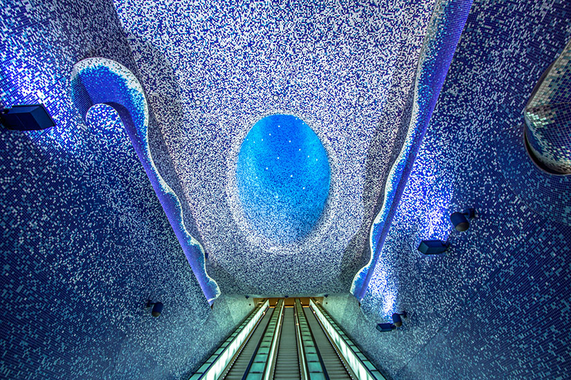 Toledo gehört visuell zweifelsohne zu den Top-Metro-Stationen. Der von einem spanischen Architekten entworfene U-Bahnhof liegt teilweise unterhalb des Meeresspiegels und wurde in Anlehnung an diesen Standort designt. So scheint ihr euch in die Tiefen des Meeres hinabzubegeben, wenn ihr die rund 40 Meter mit den Rolltreppen fahrt. Zudem hat der Standort mit seinen blauen Wänden und der aufwändig gestalteten Decke etwas Surreales. Während die unteren Partien der Station bewusst an das Abtauchen ins Wasser erinnern, ist der obere Teil ähnlich wie ein Felsen konstruiert. Auch an die Illusion von einfließendem Tageslicht durch einen Felsenkrater hat der Künstler Oscar Tusquets Blanca gedacht. Dieser gemalte Krater befindet sich über der Rolltreppe, sodass ihr ihm also passend bei eurem Weg zurück an die Oberfläche entgegenkommt. Wir könnten uns in der Schönheit dieser magischen Station völlig verlieren.