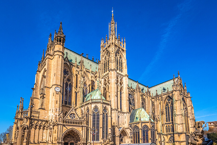 Sie gehört zu den beeindruckendsten Kirchen Frankreichs. Mit ihren fast 6.500 Quadratmetern Glasfläche ist die Kathedrale von Metz das lichtdurchflutetste Gotteshaus Europas. Farbige Fenster aus dem Mittelalter tauchen das gotische Gewölbe in ein leuchtendes Spiel aus Glanz und Schatten. Im Inneren begegnet ihr Werken des Künstlers Marc Chagall.