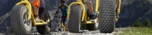 Wer vom Monsterroller noch nicht ganz überzeugt ist, der kann sich stattdessen auch ein Mountaincart mieten. Diese dreirädrigen Vehikel sind zum Sitzen gedacht, indem man über der hinteren Achse platznimmt. Die „Harley der Berge“ lässt sich dann wie ein Motorrad lenken. Gebremst wird mit einer Zweikreisbremse. Durch die clevere Aluminium-Konstruktion kommt man nämlich gut in Fahrt. Ähnlich wie bei den Monsterrollern kann man auch hier die Kombination mit dem Lift nutzen, bevor man die vorgegebenen Strecke hinab düst.