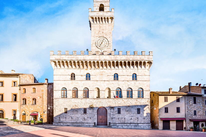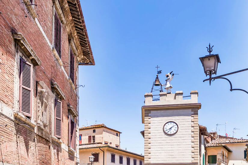Zu den beliebtesten Sehenswürdigkeiten in Montepulciano gehört dieser imposante Uhrenturm. Er steht an der Piazza Michelozzo di Bartolomeo. Auf seiner Spitze thront eine prachtvolle Pulcinella-Figur, die in der Toskana ungewöhnlich ist und eigentlich der Stadt Neapel zugeschrieben wird. Warum sie in Montepulciano zu sehen ist, bleibt weiterhin ein Rätsel.