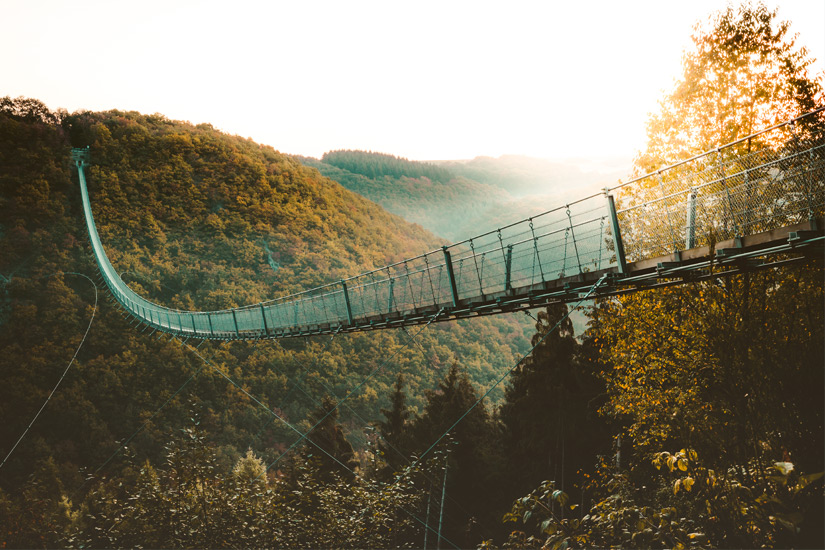 Mitten im Hunsrück in Rheinland-Pfalz befindet sich die Hängeseilbrücke Geierlay, die die Orte Mörsdorf und Sosberg verbindet. Die 360 Meter lange Brücke lässt sich sowohl zu Fuß als auch mit dem Fahrrad kostenfrei überqueren, was gerade bei Wind und Nebel eine sehr abenteuerliche Erfahrung wird, da die Hängeseilbrücke dabei leicht hin- und herschwankt.