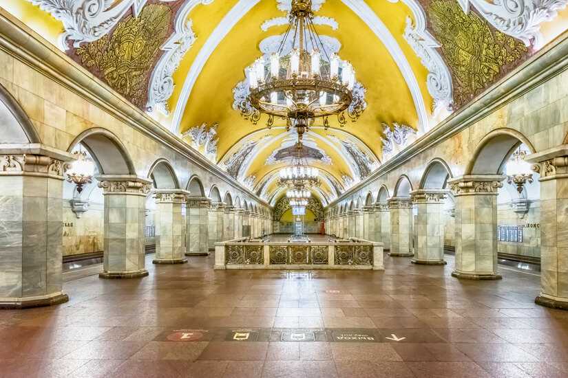 Die Metro in Moskau wird angepriesen als die schönste auf der ganzen Welt und davon solltet ihr euch unbedingt überzeugen – auch, wenn ihr keinen Weg mit der Metro zurücklegen müsst. Die Stationen gleichen unterirdischen Palästen und werden euch durch spektakuläre Wandverzierungen aus Marmor, Mosaik und Stuck sowie kristallenen Leuchtern an den Decken verzaubern. Dabei ist jede Station ein einzigartiges Kunstwerk. Und genau das war das Ziel Stalins: die Bahnhöfe sollten Paläste für das Volk werden. Hier macht sogar das Warten Freude.