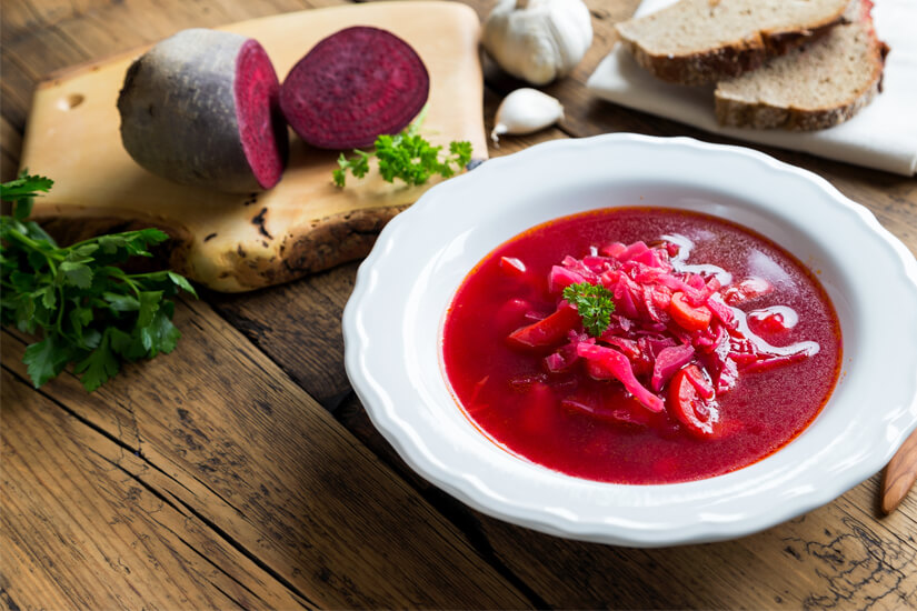 - Borschtsch: eine Suppe auf Basis einer Rinderbrühe, die mit Aal, Gemüse sowie saurer Sahne gegessen wird