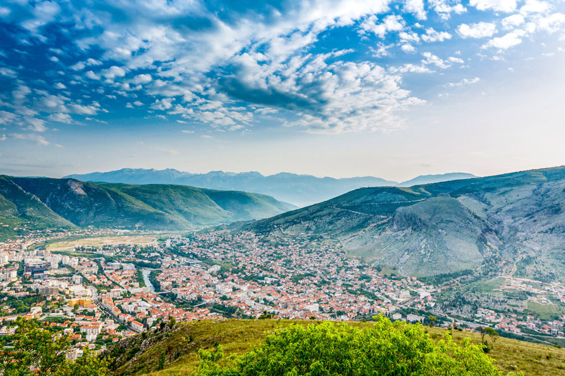Bosnien und Herzegowina ist ein sehr bergiges Land. Mostar liegt in einem Kessel zwischen zwei Bergmassiven, nämlich dem Velež mit 1968 Metern und dem Čabulja mit 1776 Metern. Wenn ihr einen schönen Blick auf die ganze Stadt werfen wollt, müsst ihr aber natürlich nicht diese Gipfel erklimmen. Es reicht ein Ausflug auf die umliegenden Berge.