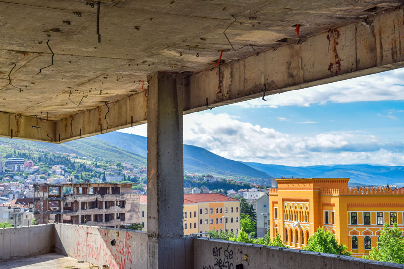 Zerstörte Gebäude und Kriegsruinen sind ein eher bedrückender Anblick, dem ihr euch aber stellen solltet, wenn ihr Mostar und seine Geschichte verstehen wollt. Vor allem im bosniakischen Osten der Stadt stehen noch so manche Ruinen aus den Zeiten des Bosnienkrieges. Auf der Westseite, nahe des Parks Zrinjevac, steht ein verfallenes ehemaliges Bankgebäude. Von hier aus machten kroatische Scharfschützen Jagd auf ihre damaligen Feinde. Der Bau wird daher auch „Sniper Tower“ genannt. Die Gebäude ringsherum weisen bis heute zahlreiche Einschusslöcher auf.