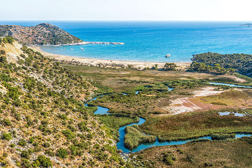 Etwa zweieinhalb Kilometer vom Zentrum entfernt, findet ihr euch am Çayağzi Beach wieder. Um zu den aufgestellten Sonnenliegen und ins Meereswasser zu laufen, empfehlen sich Badeschuhe, da es sich in diesem Abschnitt um einen Kiesstrand handelt. Folgt ihr dem Verlauf weiter, nähert ihr euch der Stelle, wo einst der Lykische Hafen Andriake die Seefahrer begrüßte. Heute befindet sich zwischen den Ruinen ein kleiner Abschnitt des Çayağzi-Strandes: Der Sand ist bräunlich und fein, während das Wasser kristallklar glänzt und selbst in der Hochsaison relativ wenig Menschen vor Ort sind, so dass Ruhesuchende auf ihre Kosten kommen.