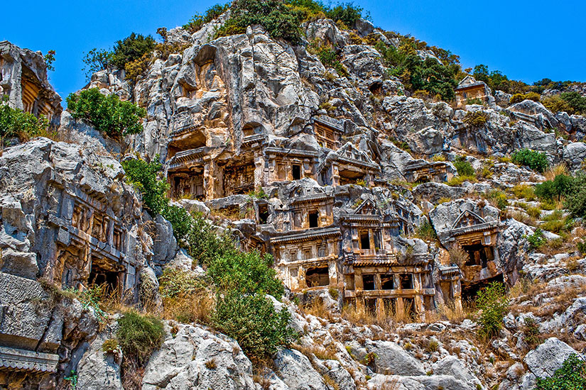 Wirklich einprägsam sind die Grabmäler, die direkt in die Felswände hineingeschlagen wurden, da Lykier ihre Verstorbenen nicht unter der Erde zur Ruhe betteten, sondern so hoch wie möglich. Zwei Nekropolen, die mit Skulpturen und Reliefs versehen sind, gehören zu Myra und begeistern mit detailreichen Arbeiten: Die westliche „Totenstadt“ wird auch Meeres- oder See-Nekropole genannt und lässt die Gräber in Richtung des offenen Meeres blicken. Die Begräbnisstätte im Osten trägt den Namen Fluss-Nekropole, da die Gräber hier zum Fluss Demre ausgerichtet sind. Insgesamt gibt es rund 2.300 Felsengräber, die von den Erbauern bewusst im Stil ihrer Wohnhäuser gestaltet wurden.
