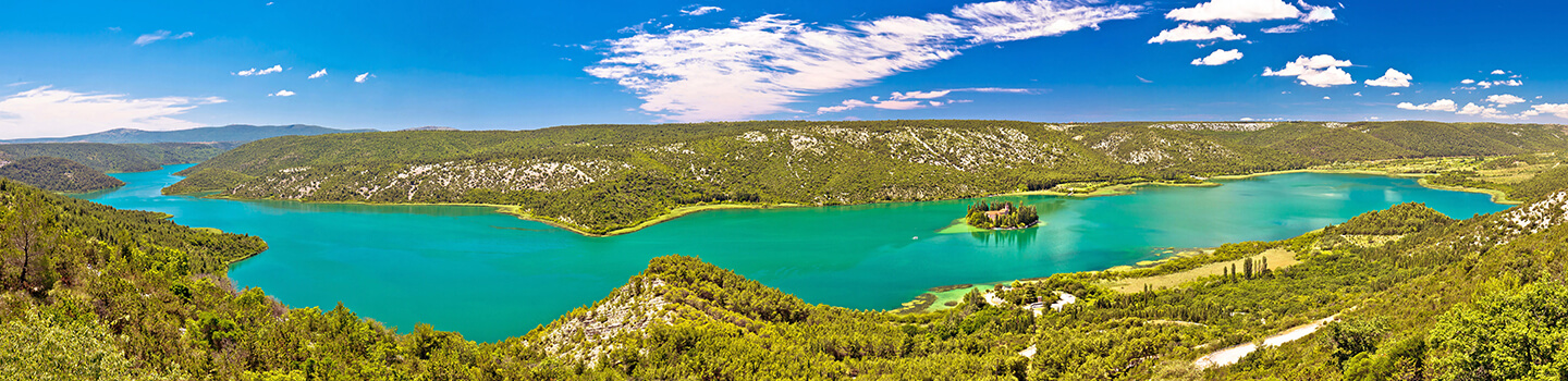 Der Nationalpark Krka liegt in Mitteldalmatien im Süden von Kroatien, nur wenige Kilometer hinter der Küstenstadt Šibenik. Auch die beliebten Urlaubsorte Split und Zadar sind nur rund 80 Kilometer entfernt. So könnt ihr den Nationalpark ganz bequem von der dalmatischen Küste aus erreichen. Benannt ist das Naturwunder nach dem Fluss Krka, der sich durch die Schluchten, Hügel und Felsen des Parks schlängelt. Der Nationalpark umfasst dabei den größten Teil des insgesamt 72 Kilometer langen Flusses, welcher in Knin entspringt und sich in Skradin in eine tiefe Meeresbucht verwandelt, bevor er in der Adria mündet. Damit ist die Krka der längste Fluss in Dalmatien und einer der aufregendsten. Entlang seines Laufes entstehen rasante Stromschnellen, idyllische Bassins und rauschende Wasserfälle.