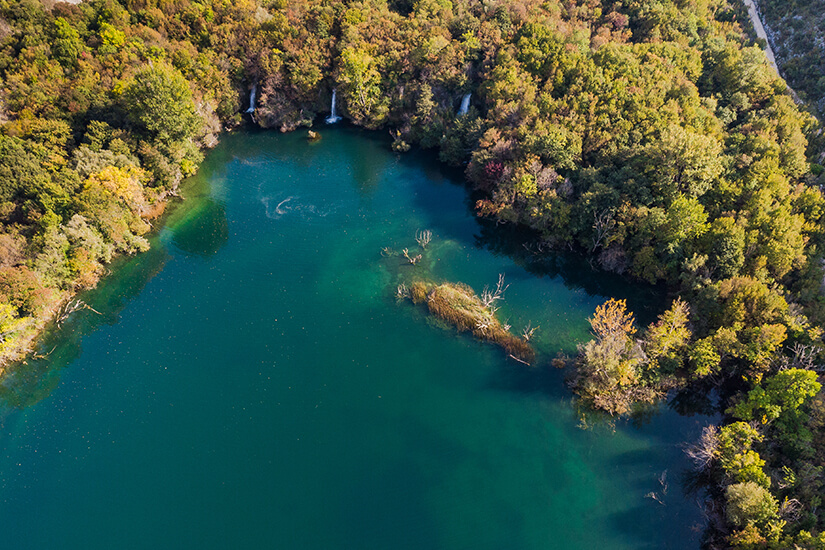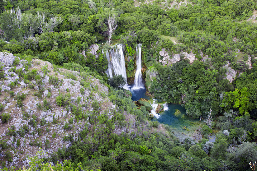 Der erste Wasserfall, der euch auf eurer Tour begegnen wird, ist der Bilušića Buk. Er befindet sich etwa zwölf Kilometer von der Flussquelle entfernt und beeindruckt mit einer Höhe von 20 Metern. Das hinunterprasselnde Wasser überwindet dabei zwei Trassen, wobei die obere Trasse künstlich angelegt wurde, um Stauwasser zu vermeiden.