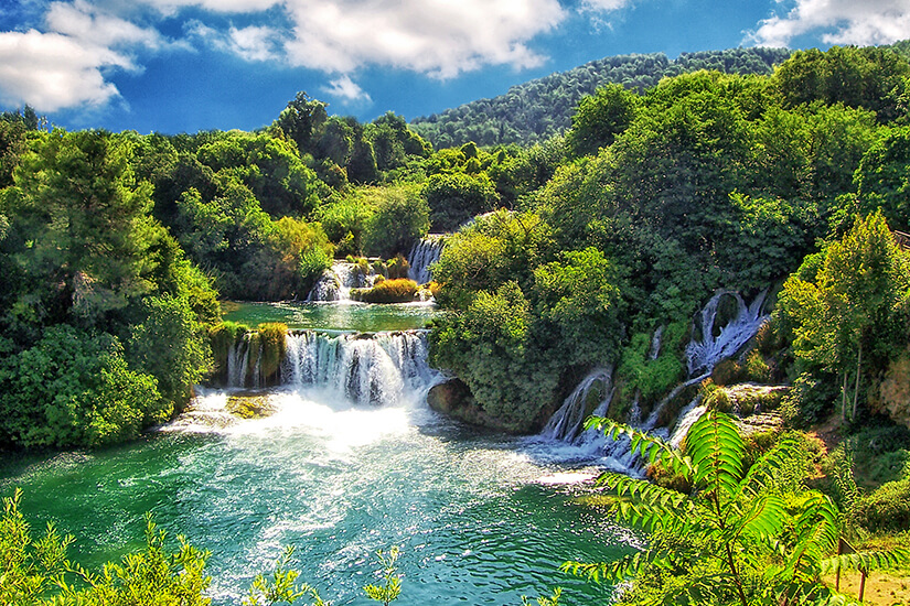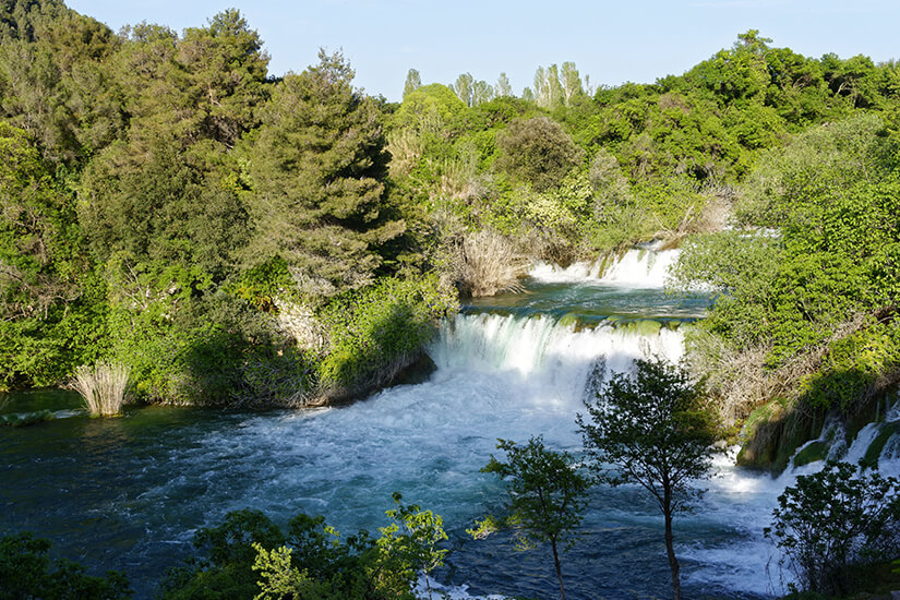 Der 650 Meter lange Wasserfall Roški slap ist besonders eindrucksvoll, denn die Krka wird an dieser Stelle sehr tosend. Inmitten einer grün bewachsenen Felslandschaft verwandelt sich der Fluss in eine reißende Stromschnelle, die schäumende Strömungen, kleine Wasserfälle und zischende Strudel hervorbringt.