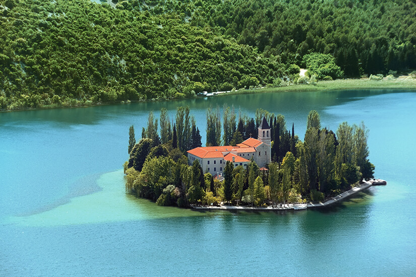 Der See Visovac birgt eine ganz besondere Sehenswürdigkeit, nämlich ein altes Franziskanerkloster, was sich inmitten des Sees auf einer kleinen Insel befindet. Ihr erreicht das kulturelle Erbe in etwa 30 Minuten mit einem Boot, welches regelmäßig vom Wasserfall Skradinski Buk zur Insel schippert. Dort angekommen erwartet euch ein Kloster, welches im 14. Jahrhundert von den Augustinermönchen gegründet wurde. Nur einige Jahre später übernahmen jedoch die Franziskaner das Gelände und bauten ihr eigenes Kloster auf der Insel.
