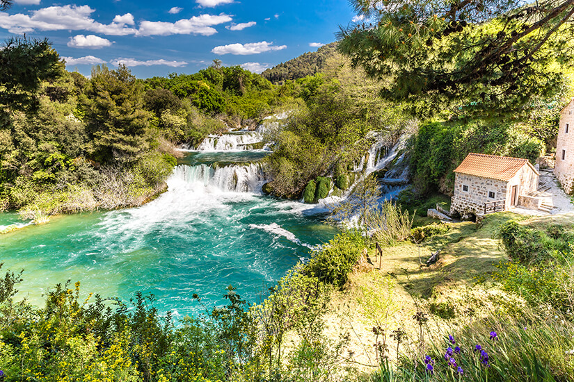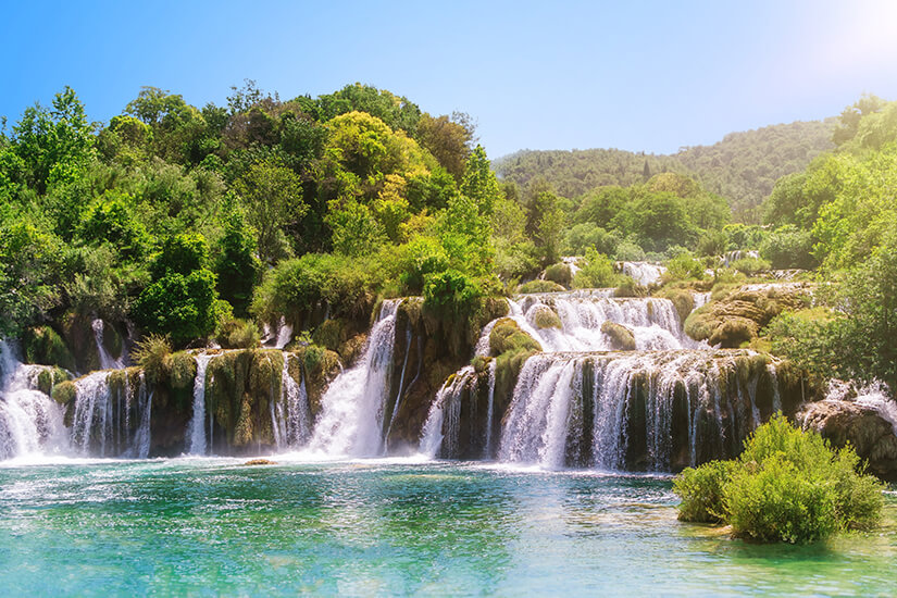 Die absoluten Highlights des Nationalparks Krka sind jedoch nicht die Ruinen aus Zeiten der Römer, die glitzernden Seenlandschaften und die einzigartige Tier- und Pflanzenwelt. Es sind insgesamt sieben wunderschöne Wasserfälle, die sich paradiesisch in die Landschaft einfügen. Von zahlreichen Aussichtspunkten der Region könnt ihr diese aus ganz besonderen Perspektiven bestaunen. Mit Blick auf die grünen Wälder, die blühenden Blumen und die blaugrünen Seen mit den kleinen Inseln, werdet ihr definitiv den Alltagsstress weit hinter euch lassen.
