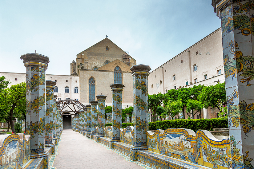 Wenn ihr auf eurem Ausflug durch die Stadt ein wenig Ruhe braucht, solltet ihr die Basilika Santa Chiara besuchen. Im Inneren dieser Anlage befindet sich nämlich ein Kreuzgang mit Klostergarten, der als einer der schönsten Kampaniens gilt. Der sanft plätschernde Brunnen in der Mitte und die zahlreichen, prachtvoll verzierten Bänke laden hier zum Verweilen ein. Außerdem ist der gesamte Kreuzgang mit prachtvollen Majolikafliesen bedeckt, es gibt darüber hinaus ein Museum und Ausgrabungen zu besichtigen.