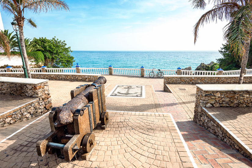 Da, wo sich heute der Balkon Europas befindet, stand früher eine Geschützbatterie. Jedoch wurden der militärische Stützpunkt und zwei dazugehörige Türme während des Halbinselkrieges, einem Abschnitt der Napoleonischen Kriege von 1807 bis 1814, komplett zerstört. Heute erinnern zwei rostige Kanonen an die Geschichte des Standortes. Der Aussichtspunkt ist ein Wahrzeichen der Stadt und wurde angeblich von den Worten Königs Alfons XII. inspiriert. Dieser soll nach einem verheerenden Erdbeben in Andalusien im Jahr 1885 den Blick auf das offene Meer mit dem Satz „Das hier ist der Balkon Europas“ gewürdigt haben. In Wahrheit existierte die Bezeichnung jedoch schon vor dem Besuch des Monarchen. Das soll dem Erlebnis jedoch keinen Abbruch tun. Denn die Aussicht über die schroffen Küsten und einen schier nicht enden wollenden Horizont wird garantiert zu einem absoluten Highlight eures Urlaubs in Nerja avancieren.