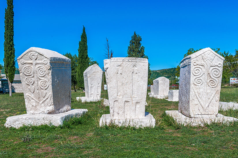 Diese antiken Grabstätten werden Stećci (Singular Stećak) genannt und sind stille Zeugen vergangener Zeiten. Die Bezeichnung leitet sich vom slawischen Verb „stojati“ ab und kann mit „aufrecht stehen“ übersetzt werden. Genau dieser Anblick erwartet euch: Die Steine erheben sich als aufrechte Blöcke gen Himmel und zeigen als Flachreliefs verschiedene Altersszenen aus dem Leben der im Mittelalter hier lebenden Volksgruppen. Viele der Stećci sind über 500 Jahre alt und der Anblick entführt auf eine Reise in die Lebensweise dieser christlichen Religionsgemeinschaft. Zu sehen sind Ritterspiele, Szenen der Jagd und Alltagsmomente sowie typische Symbole wie Kreuze. Von den rund 70.000 gefundenen außergewöhnlichen Grabsteinen befinden sich viele in Bosnien-Herzegowina und weitere in Kroatien sowie Serbien und Montenegro.