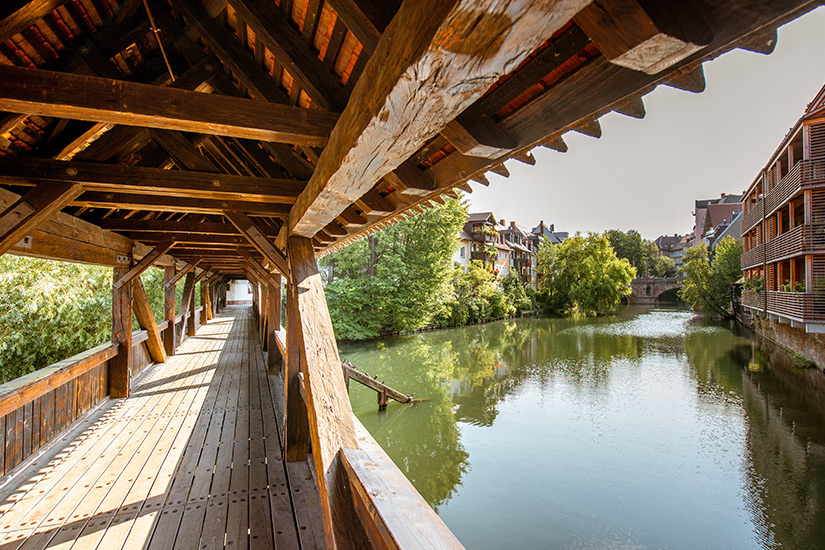Wollt ihr eine der romantischsten Kulissen Nürnbergs besuchen, solltet ihr dem Henkersteg sowie dem Weinstadel nahe der Maxbrücke in der Altstadt einen Besuch abstatten. Der Henkersteg ist ein Holzsteg, welcher euch über die Pegnitz führt. Euren Spaziergang startet ihr daher am besten am Henkerhaus mit dem zugehörigen Turm, in dem zwischen dem 15. und 19. Jahrhundert die Henker der Stadt lebten. Direkt daneben könnt das alte Weinlager bestaunen, das heute als Weinstadel bekannt ist. Das mittelalterliche renovierte Fachwerkhaus ist heute eines der bedeutendsten Baudenkmäler der Stadt und gleichzeitig ein Studentenwohnheim. Wollt ihr das Ensemble aller Gebäude ablichten, solltet ihr dies am besten von der Maxbrücke tun.