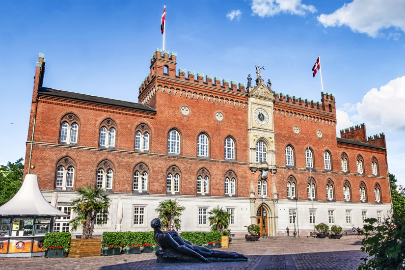 Andersen-Skulpturen hier, ein Andersen-Museum dort. Märchenhafte Spuren sind in Odense allgegenwärtig. Mit dem Rathaus hat die Stadt aber auch eine weltliche Sehenswürdigkeit, die unbedingt eine Besichtigung lohnt. Das 1881 bis 1883 errichtete Bauwerk ist italienisch-gotisch inspiriert und wirkt neben den aufragenden Kirchen der Stadt eher bescheiden. Auf dem Platz vor dem Rathaus ist hingegen immer etwas los. In der seitlich gelegenen Vestergade befindet sich eine Verleihstation für Fahrräder.