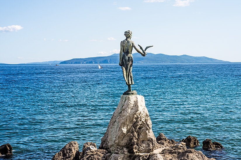 Auf der Landzunge vor dem ehemaligen Friedhof steht die vom Bildhauer Zvonko Car im Jahre 1956 geschaffene Skulptur eines Mädchens, das auf das Meer schaut und eine Möwe mit ausgebreiteten Flügeln auf ihrer Handfläche hält. Diese schöne Statue ist heute das Wahrzeichen von Opatija und eignet sich hervorragend für ein Erinnerungsfoto.